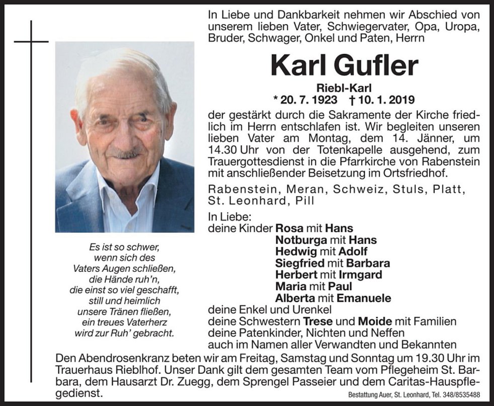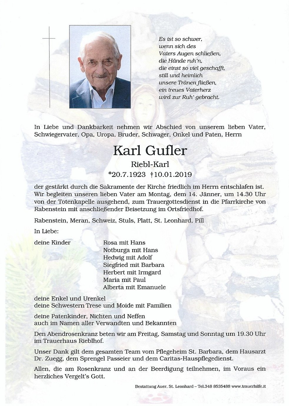 Wir begleiten unseren lieben Vater am Montag, dem 14. Jänner, um 14.30 Uhr von der Totenkapelle ausgehend, zum Trauergottesdienst in die Pfarrkirche von Rabenstein mit anschließender Beisetzung im Ortsfriedhof.
