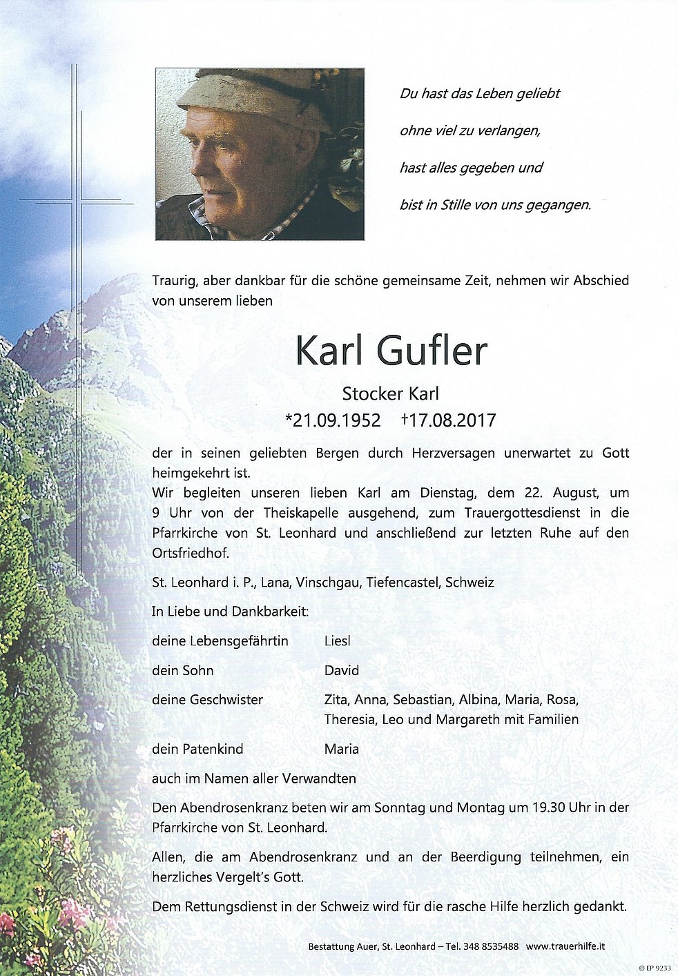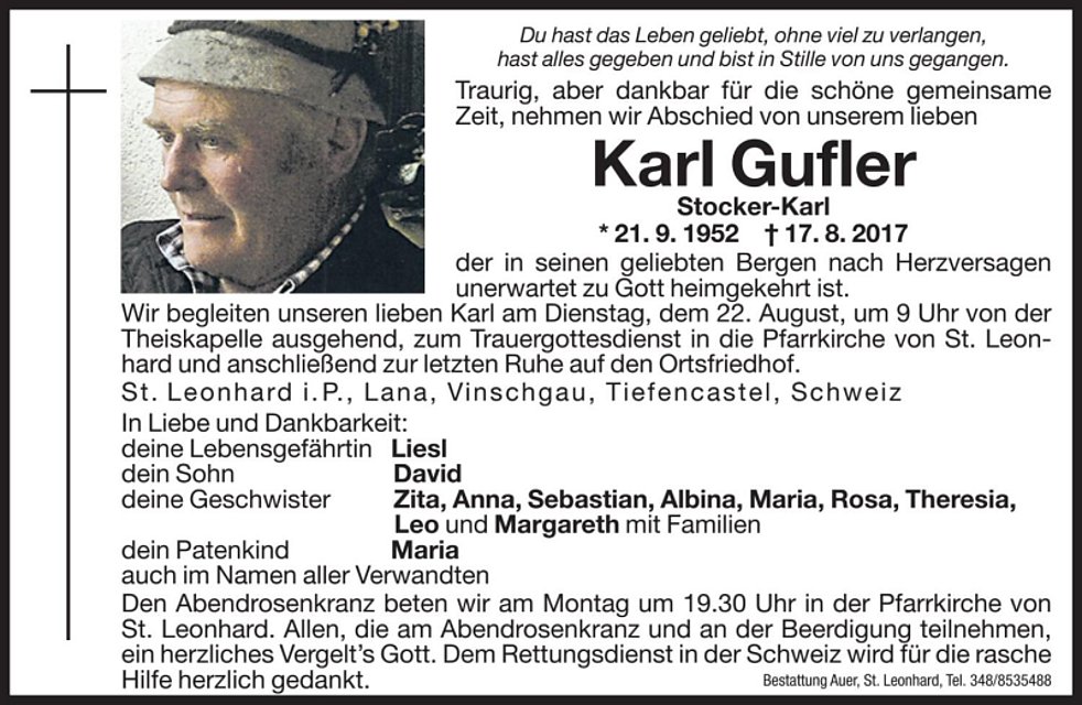 Wir begleiten unseren lieben Karl am Dienstag, dem 22. August, um 9 Uhr von der Theiskapelle ausgehend, zum Trauergottesdienst in die Pfarrkirche von St. Leonhard und anschließend zur letzten Ruhe auf den Ortsfriedhof.