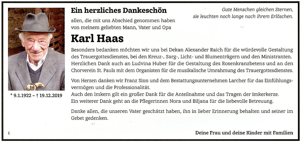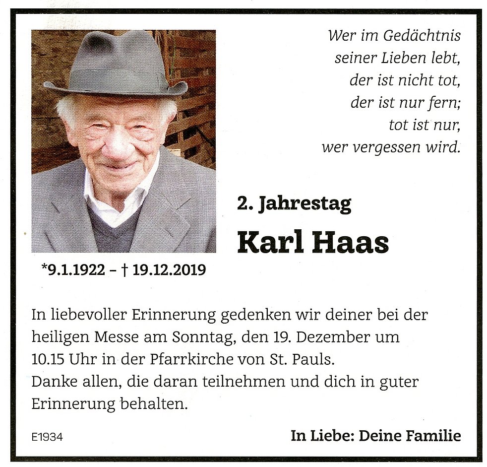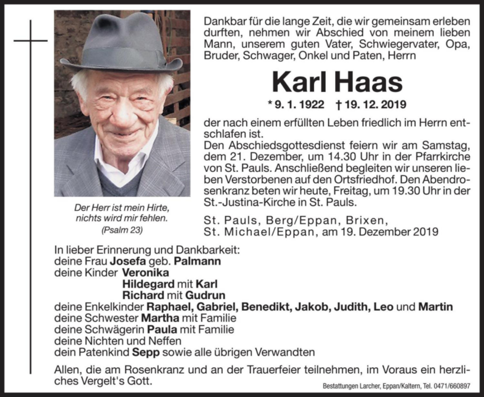 Den Abschiedsgottesdienst feiern wir am Samstag, dem 21. Dezember um 14.30 Uhr in der Pfarrkirche von St. Pauls. Anschließend begleiten wir unseren lieben Verstorbenen auf den Ortsfriedhof. Den Abendrosenkranz beten wir heute, Freitag, um 19.30 Uhr in der St. Justinakirche in St. Pauls.