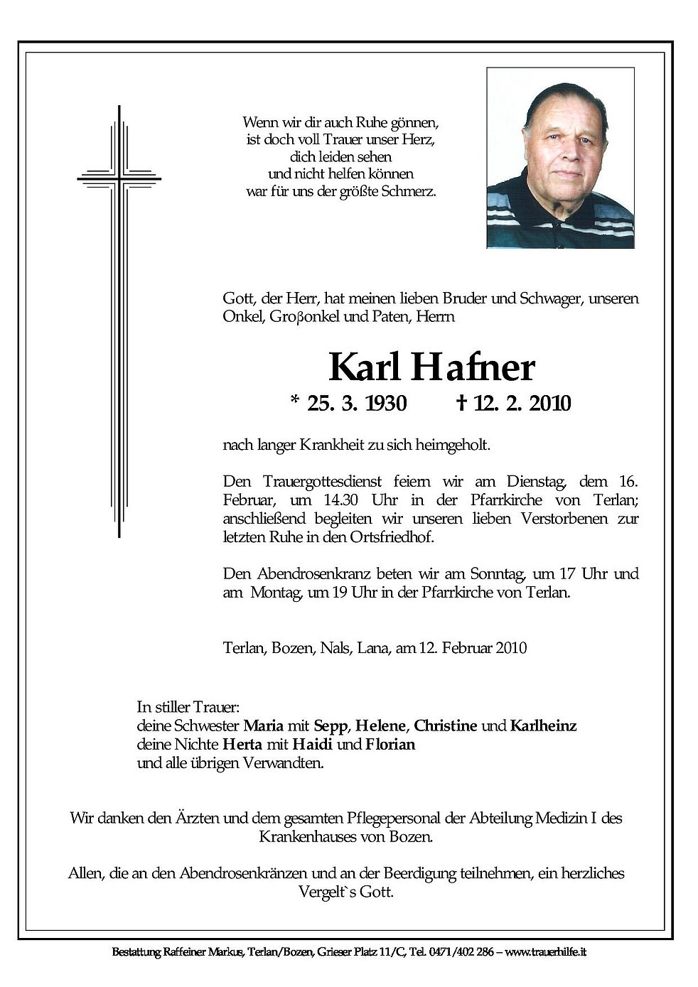 Den Trauergottesdienst feiern wir am Dienstag, dem 16. Februar, um 14.30 Uhr in der Pfarrkirche von Terlan; anschließend begleiten wir unseren lieben Verstorbenen zur letzten Ruhe in den Ortsfriedhof.