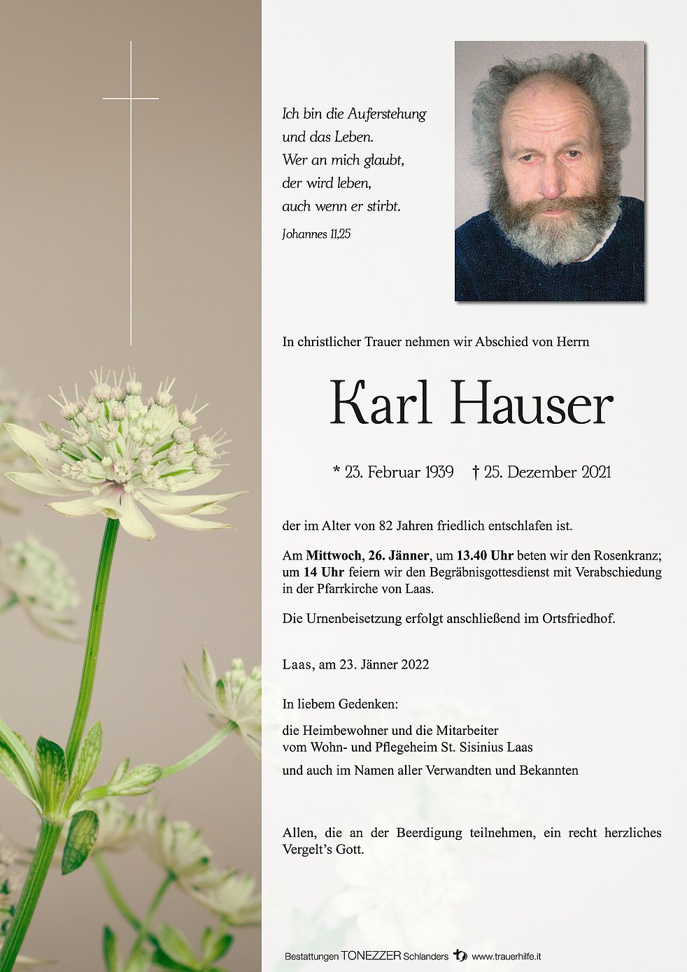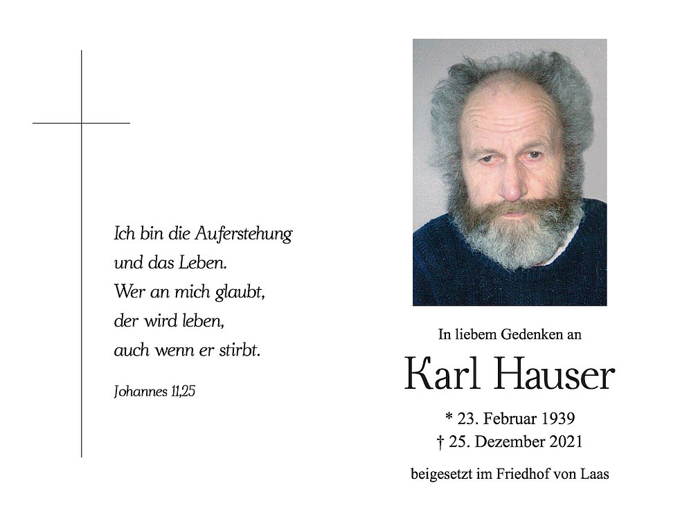 Am Mittwoch, 26. Jänner, um 13.40 Uhr beten wir den Rosenkranz; um 14 Uhr feiern wir den Begräbnisgottesdienst mit Verabschiedung in der Pfarrkirche von Laas.