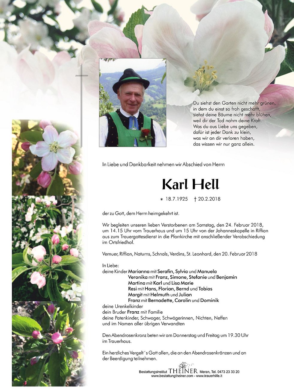Wir begleiten unseren lieben Verstorbenen am Samstag, den 24. Februar 2018, um 14.15 Uhr vom Trauerhaus und um 15 Uhr von der Johanneskapelle in Riffian aus zum Trauergottesdienst in die Pfarrkirche mit anschließender Verabschiedung im Ortsfriedhof.