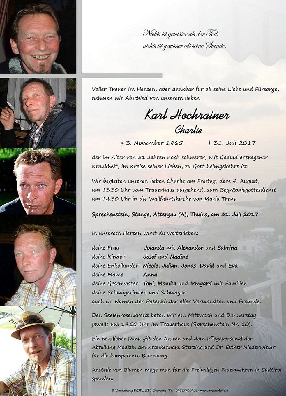 Anstelle von Blumen möge man für die Freiwilligen Feuerwehren in Südtirol spenden.