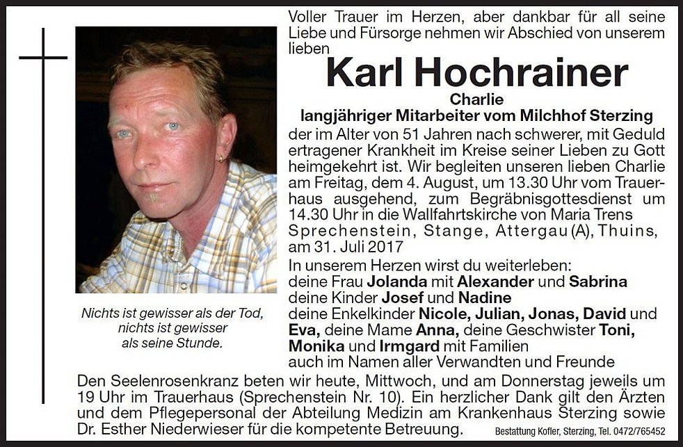 Wir begleiten unseren lieben Charlie am Freitag, dem 4. August, um 13.30 Uhr vom Trauerhaus ausgehend, zum Begräbnisgottesdienst um 14.30 Uhr in die Wallfahrtskirche von Maria Trens.