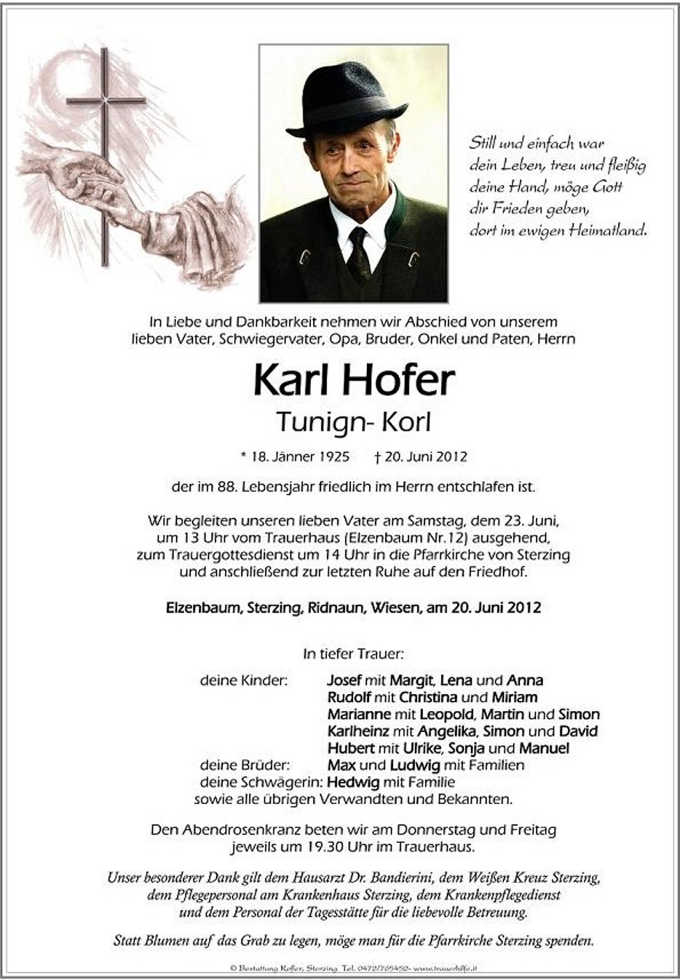 Statt Blumen auf das Grab zu legen, möge man für die Pfarrkirche Sterzing spenden.