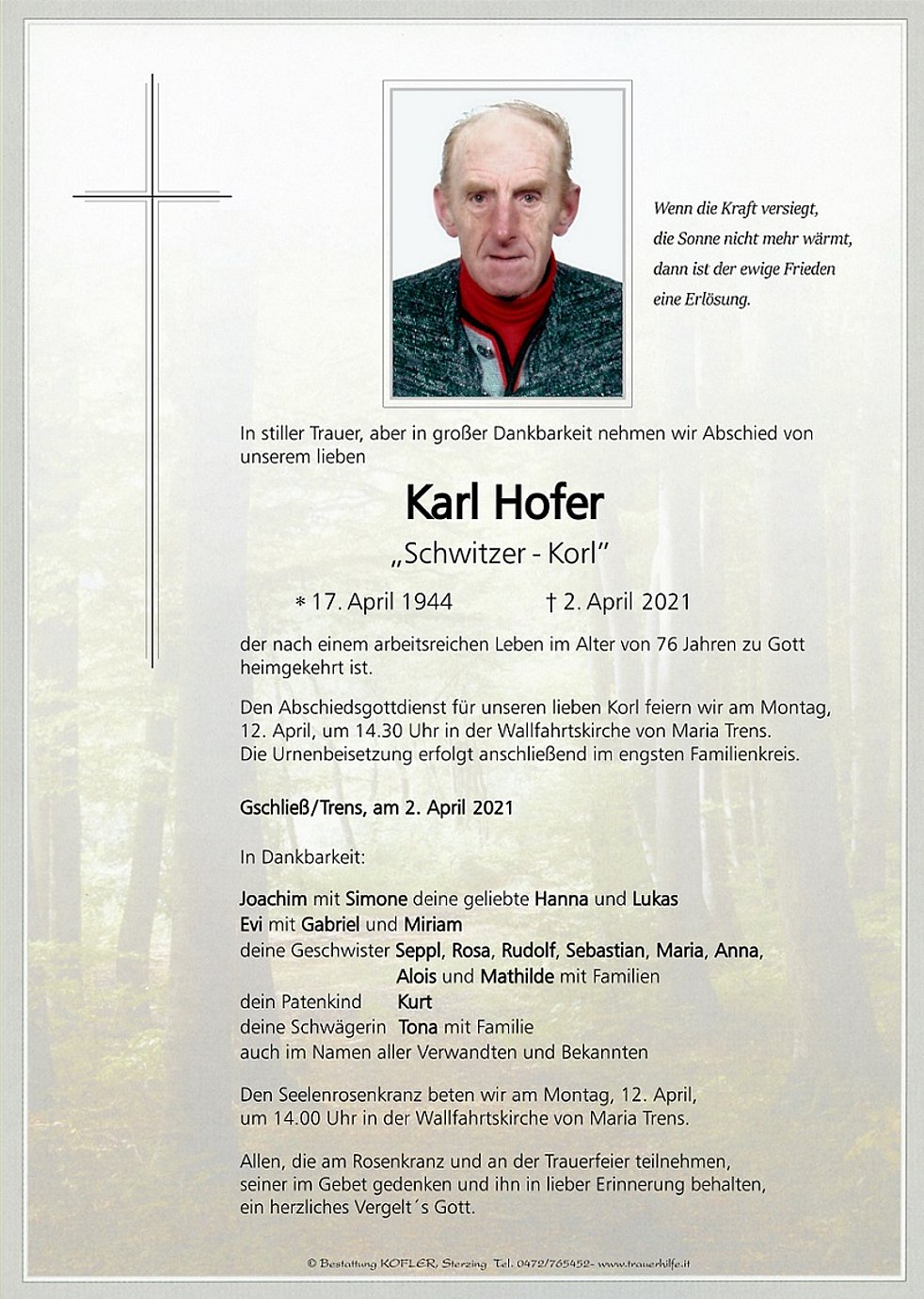 Den Abschiedsgottdienst für unseren lieben Korl feiern wir am Montag, 12. April, um 14.30 Uhr in der Wallfahrtskirche von Maria Trens. Die Urnenbeisetzung erfolgt anschließend im engsten Familienkreis.