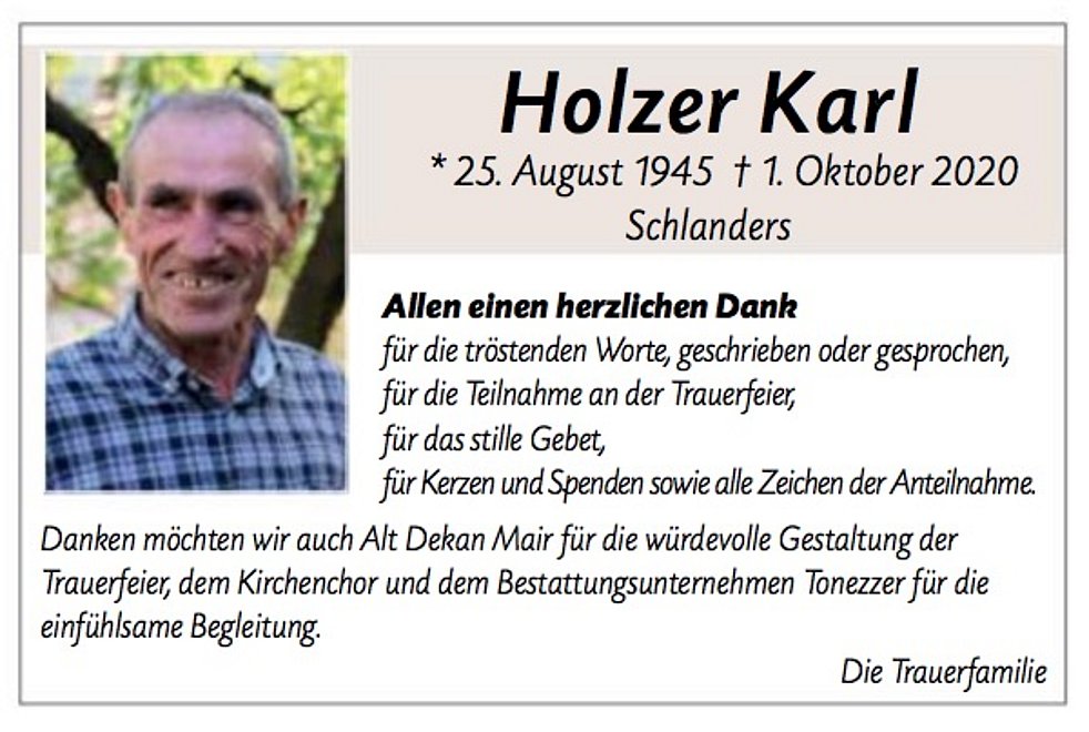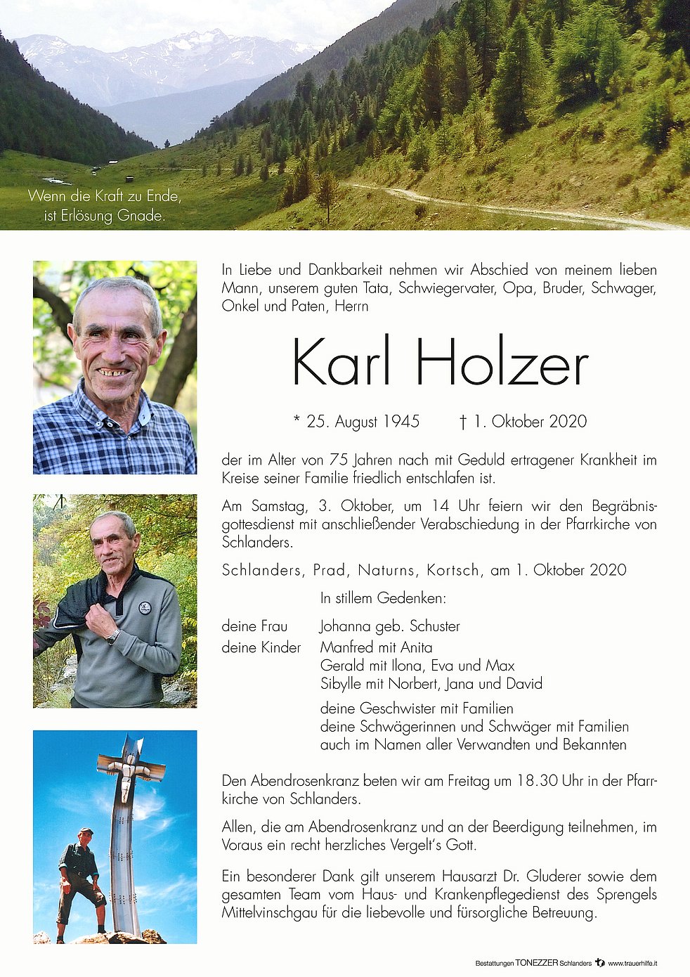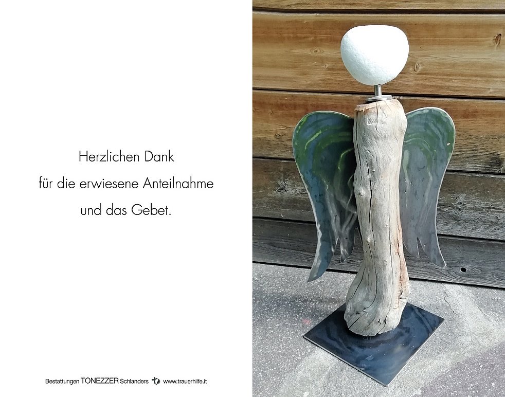 Ein besonderer Dank gilt unserem Hausarzt Dr. Gluderer sowie dem gesamten Team vom Haus- und Krankenpflegedienst des Sprengels Mittelvinschgau für die liebevolle und fürsorgliche Betreuung.