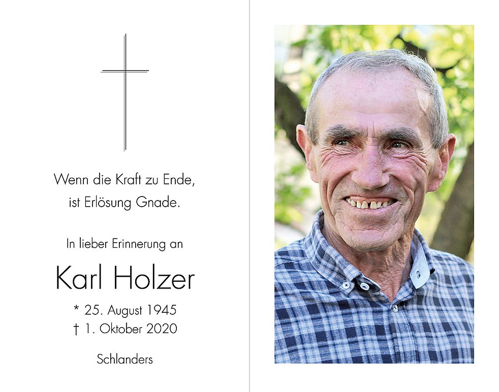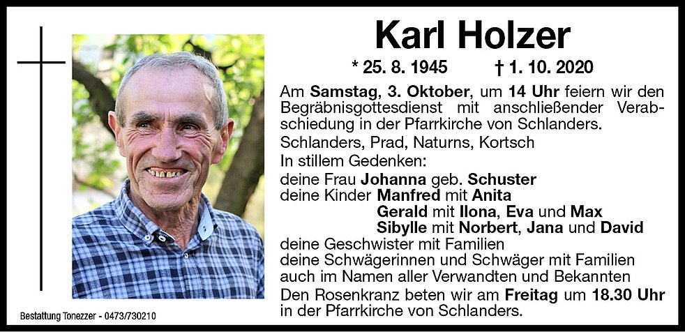 Am Samstag, 3. Oktober, um 14 Uhr feiern wir den Begräbnis- gottesdienst mit anschließender Verabschiedung in der Pfarrkirche von Schlanders.