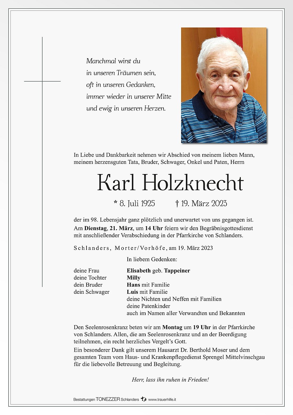 Ein besonderer Dank gilt unserem Hausarzt Dr. Berthold Moser und dem gesamten Team vom Haus- und Krankenpflegedienst Sprengel Mittelvinschgau für die liebevolle Betreuung und Begleitung.