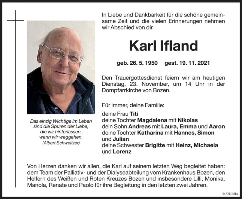 Von Herzen danken wir allen, die Karl auf seinem letzten Weg begleitet haben: dem Team der Palliativ- und der Dialyseabteilung vom Krankenhaus Bozen, den Helfern des Weißen und Roten Kreuzes Bozen und insbesondere Lilli, Monika, Manola, Renate und Paolo für ihre Begleitung in den letzten zwei Jahren.
