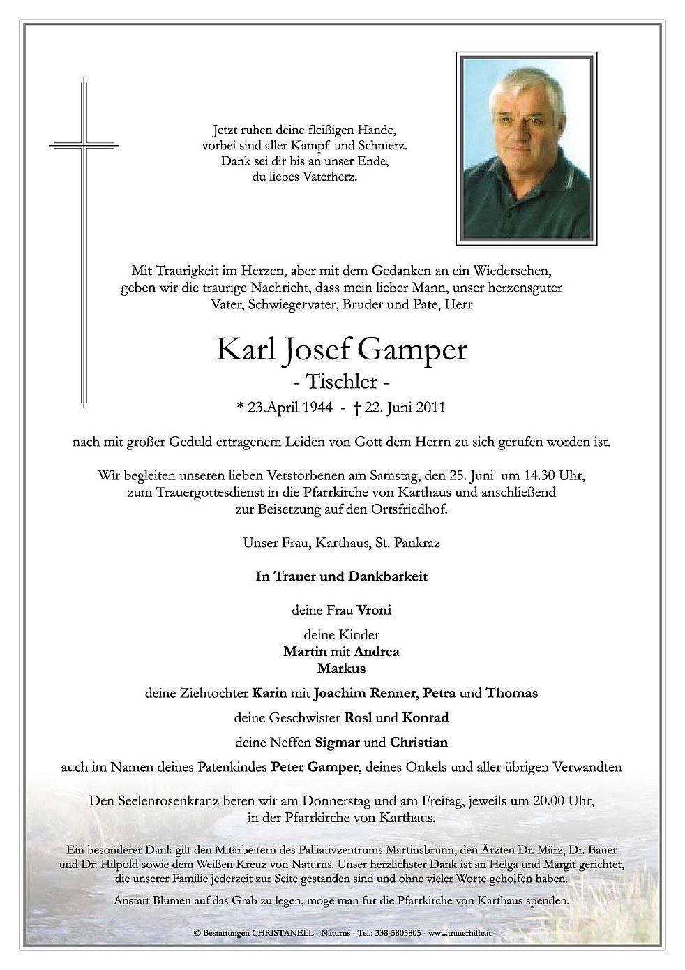 Wir begleiten unseren lieben Verstorbenen am Samstag, den 25. Juni um 14.30 Uhr, zum Trauergottesdienst in die Pfarrkirche von Karthaus und anschließend zur Beisetzung auf den Ortsfriedhof.