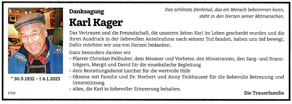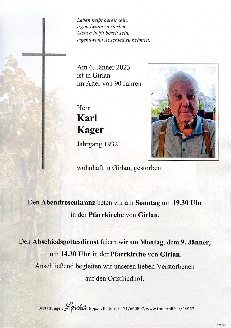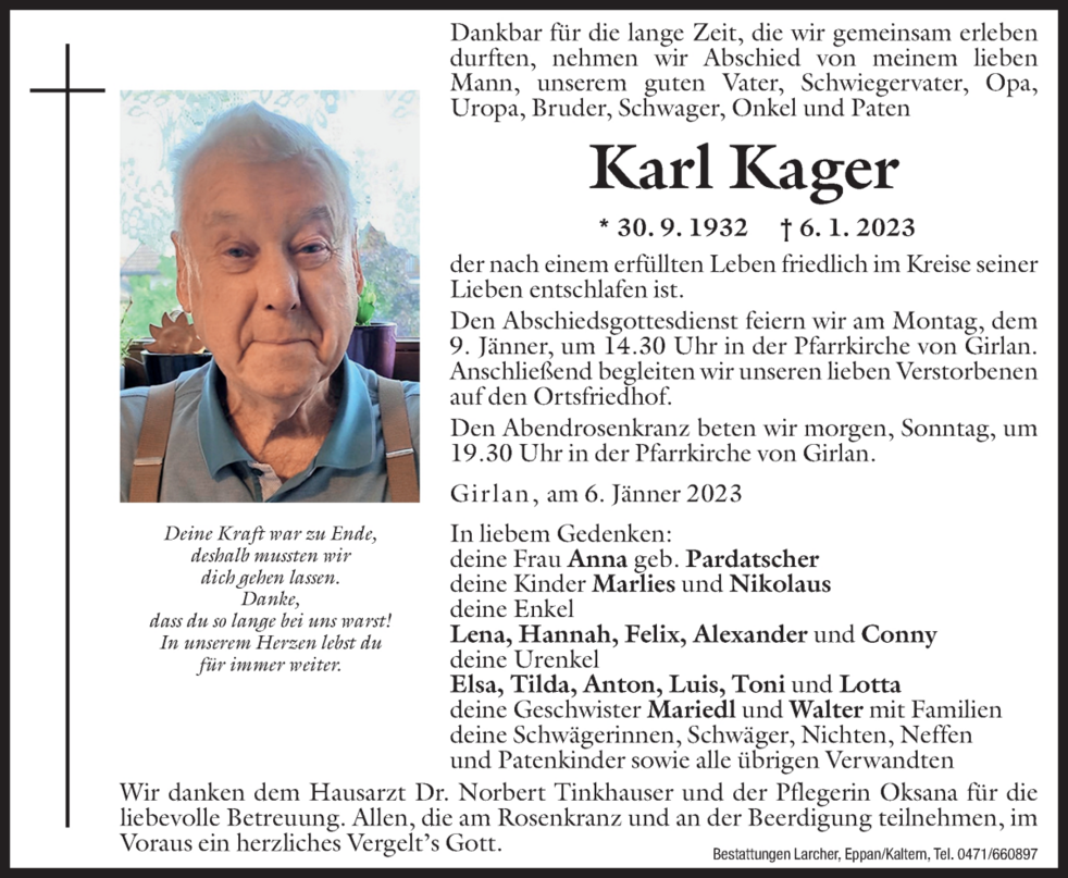 Den Abschiedsgottesdienst feiern wir am Montag, dem 9. Jänner um 14.30 Uhr in der Pfarrkirche von Girlan. Anschließend begleiten wir unseren lieben Verstorbenen auf den Ortsfriedhof.