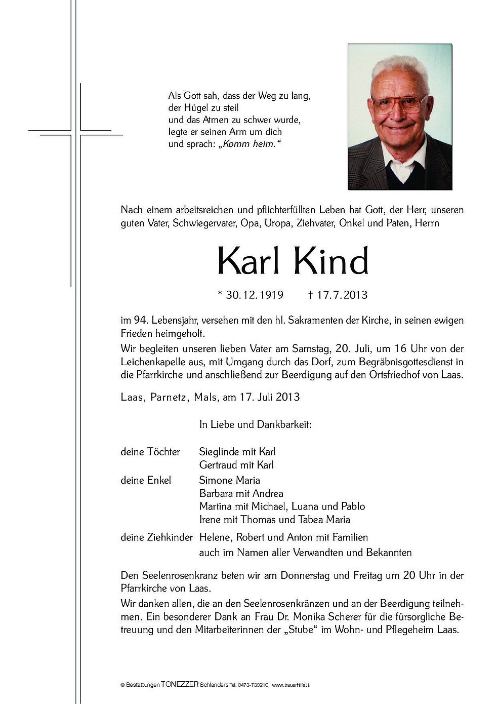Wir begleiten unseren lieben Vater am Samstag, 20. Juli, um 16 Uhr von der Leichenkapelle aus, mit Umgang durch das Dorf, zum Begräbnisgottesdienst in die Pfarrkirche und anschließend zur Beerdigung auf den Ortsfriedhof von Laas.