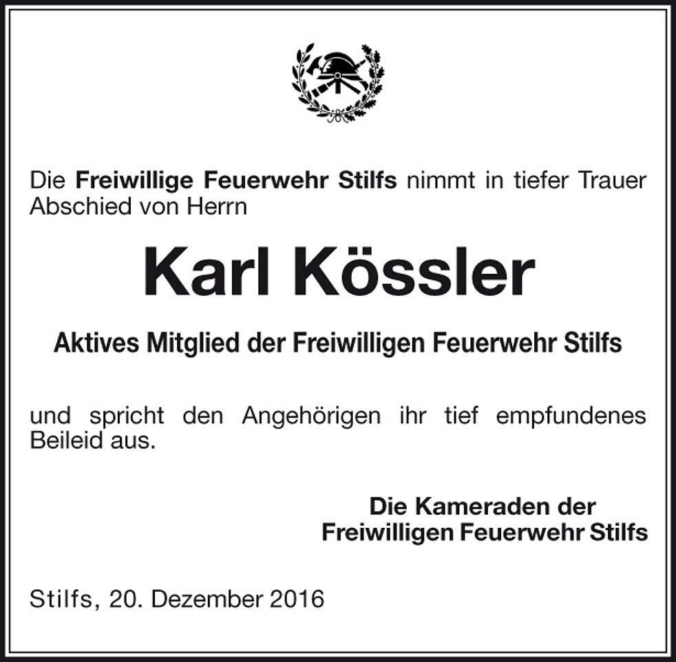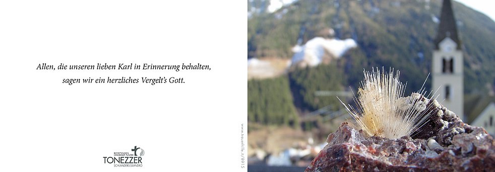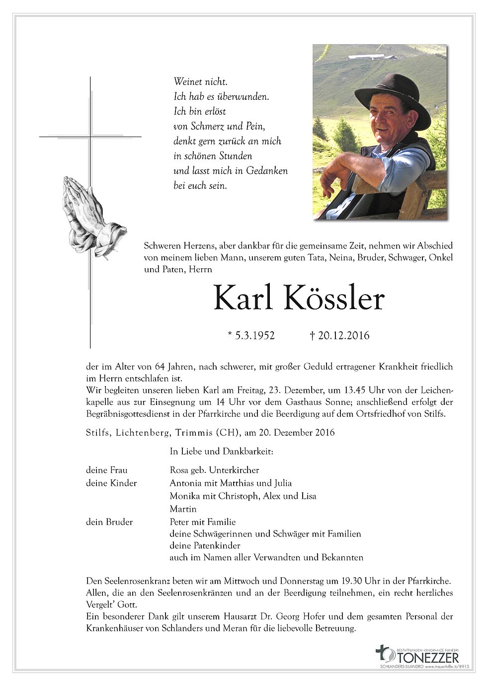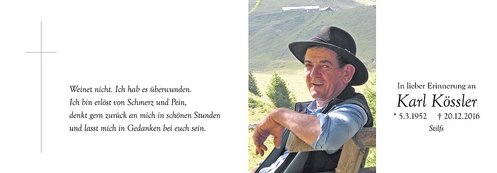 Wir begleiten unseren lieben Karl am Freitag, 23. Dezember, um 13.45 Uhr von der Leichenkapelle aus zur Einsegnung um 14 Uhr vor dem Gasthaus Sonne; anschließend erfolgt der Begräbnisgottesdienst in der Pfarrkirche und die Beerdigung auf dem Ortsfriedhof von Stilfs.