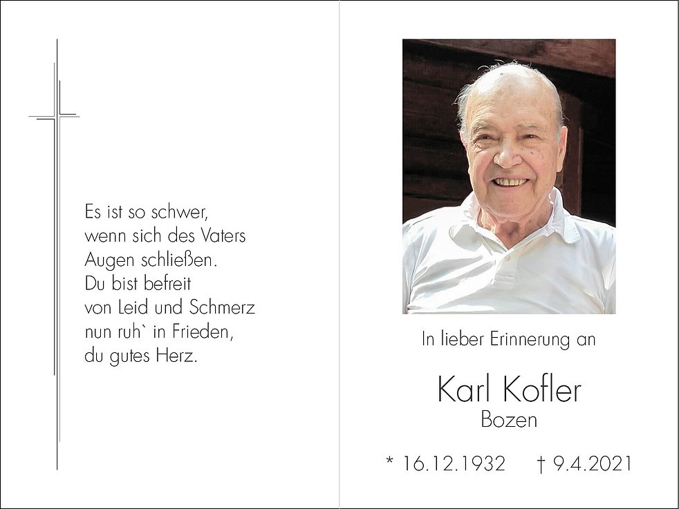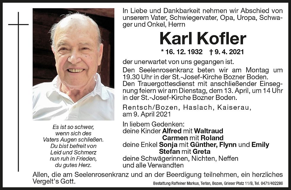 Den Trauergottesdienst mit anschließender Einsegnung feiern wir am Dienstag, dem 13. April, um 14 Uhr in der St.-Josef-Kirche Bozner-Boden.