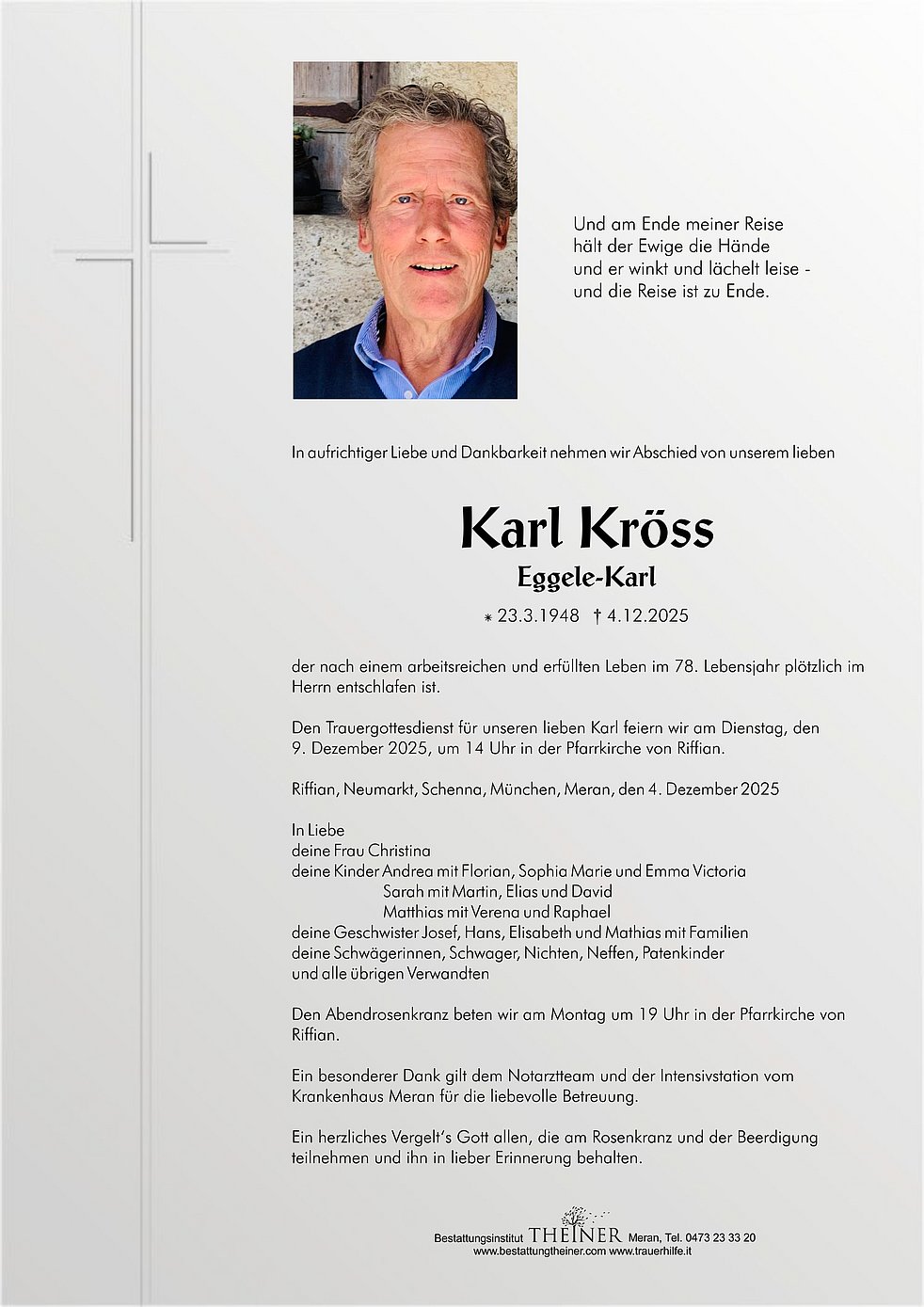 Den Trauergottesdienst für unseren lieben Karl feiern wir am Dienstag, den 9. Dezember 2025, um 14 Uhr in der Pfarrkirche von Riffian.