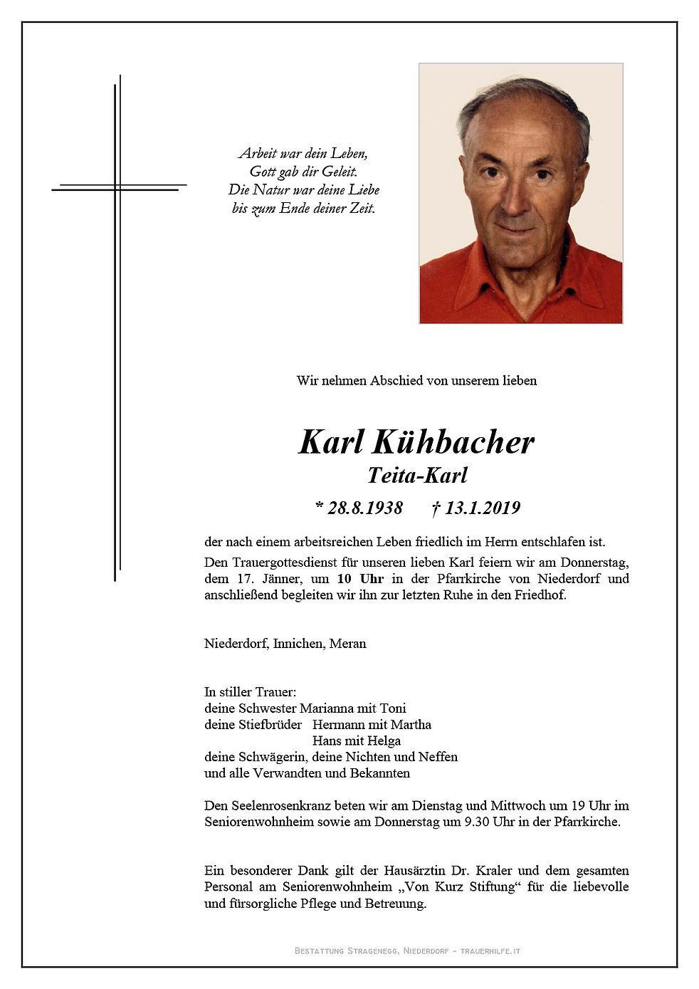 Den Trauergottesdienst für unseren lieben Karl feiern wir am Donnerstag, dem 17. Jänner, um 10 Uhr in der Pfarrkirche von Niederdorf und anschließend begleiten wir ihn zur letzten Ruhe in den Friedhof.