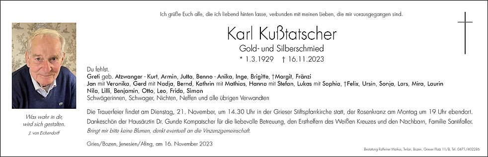 Die Trauerfeier findet am Dienstag, 21. November, um 14.30 Uhr in der Grieser Stiftspfarrkirche statt, der Rosenkranz am Montag um 19 Uhr ebendort.