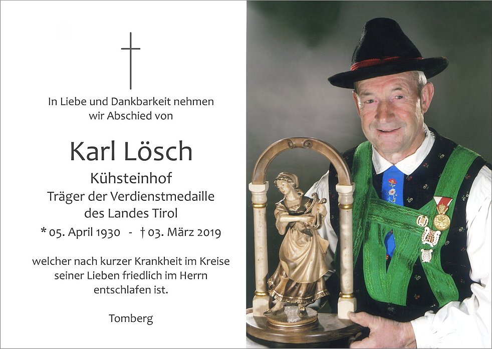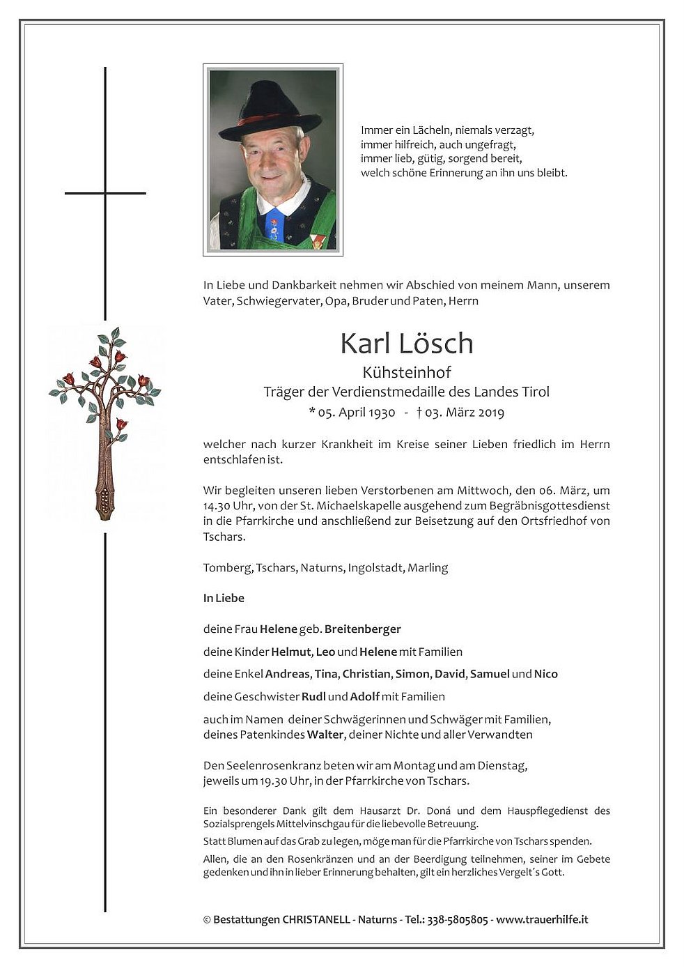 Wir begleiten unseren lieben Verstorbenen am Mittwoch, den 06. März, um 14.30 Uhr, von der St. Michaelskapelle ausgehend zum Begräbnisgottesdienst in die Pfarrkirche und anschließend zur Beisetzung auf den Ortsfriedhof von Tschars.