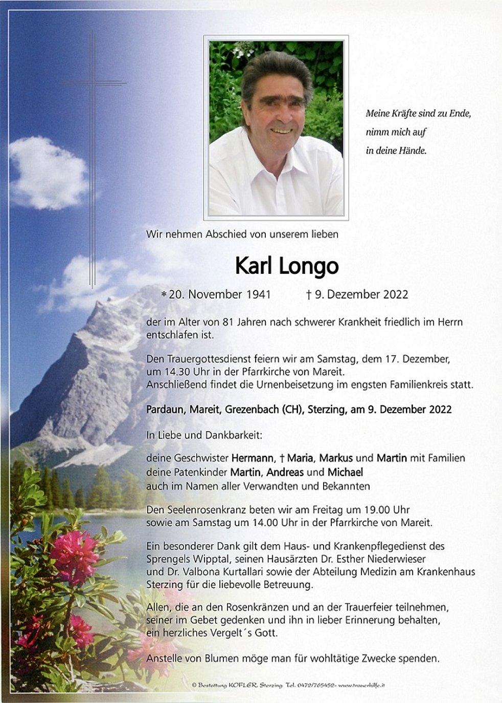 Den Trauergottesdienst feiern wir am Samstag, dem 17. Dezember, um 14.30 Uhr in der Pfarrkirche von Mareit. Anschließend findet die Urnenbeisetzung im engsten Familienkreis statt.