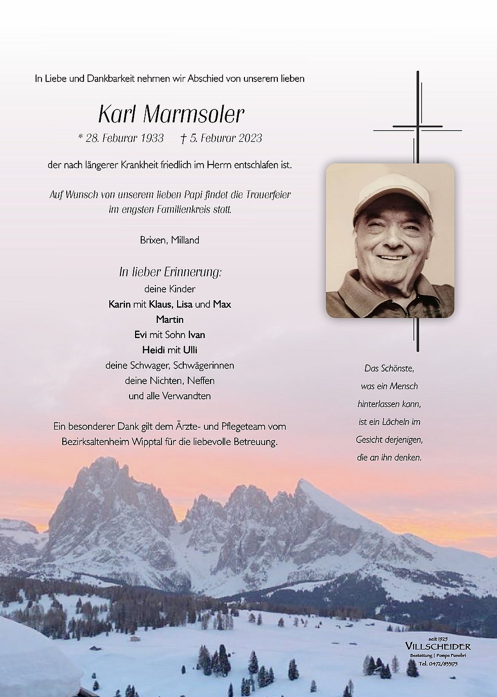 Karl war einige Jahre Mitbewohner unserer Mama im Bezirksaltenheim Sterzing und dort hab ich ihn kennengelernt. Gerne erinnere ich mich an sein Lächeln und seine Hilfsbereitschaft. Er wird immer in unserer Erinnerung bleiben.
