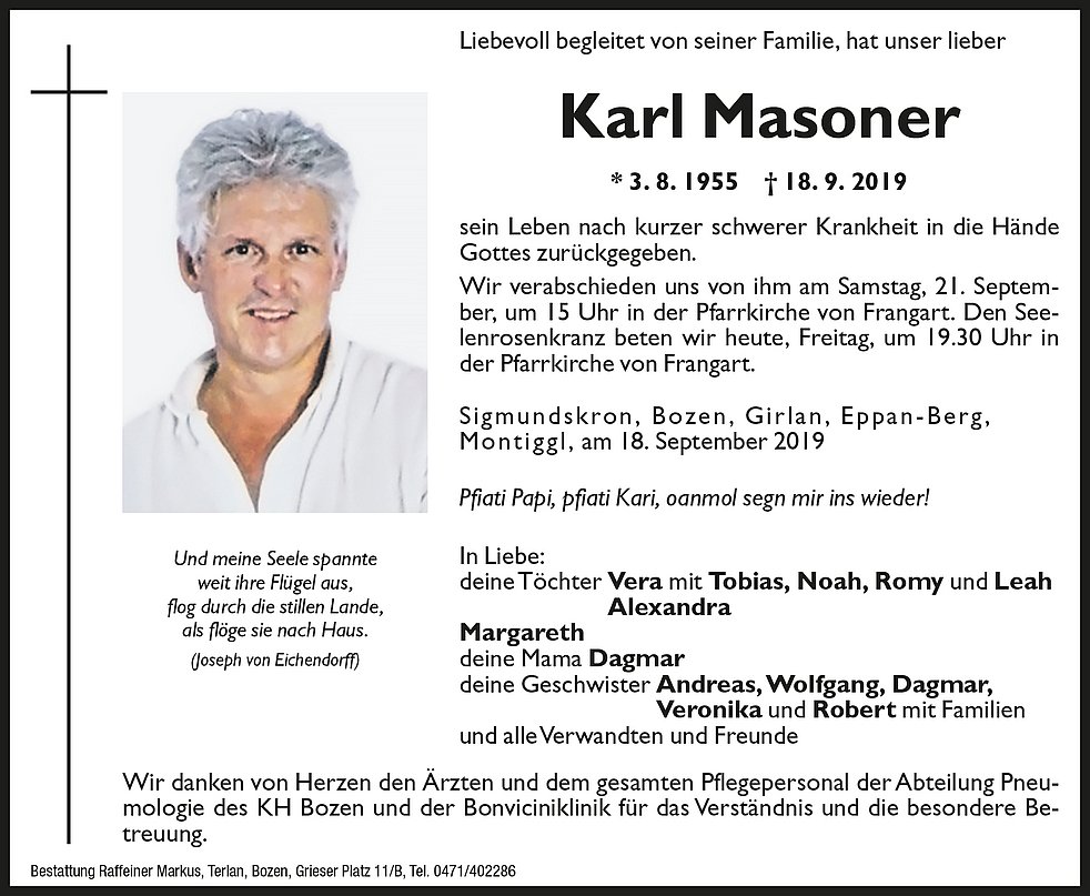 Wir verabschieden uns von ihm am Samstag, 21. September, um 15 Uhr in der Pfarrkirche von Frangart.