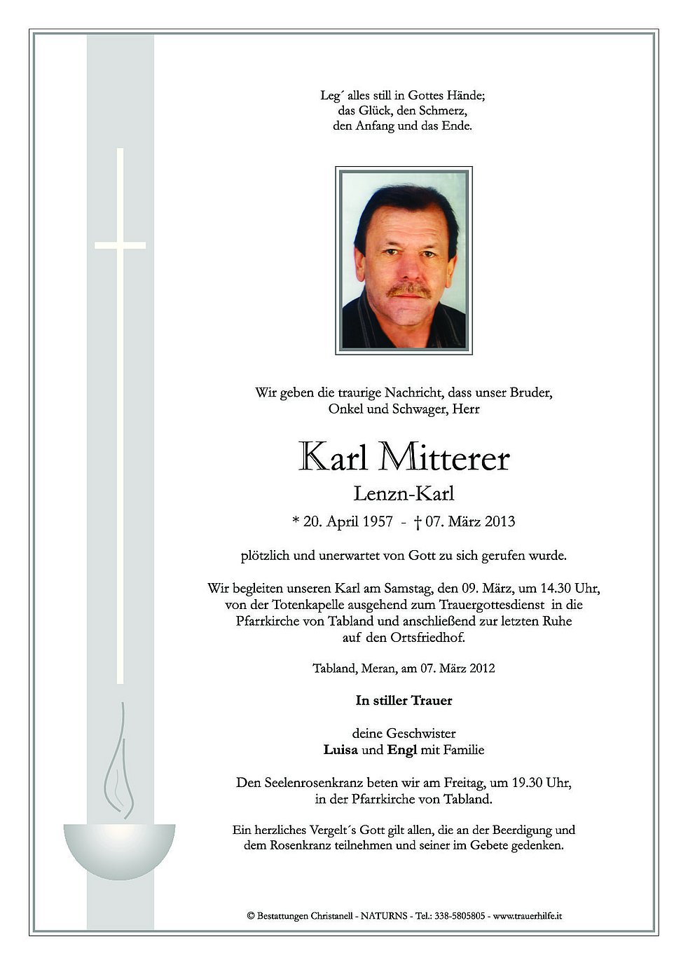 Wir begleiten unseren Karl am Samstag, den 09. März, um 14.30 Uhr, von der Totenkapelle ausgehend zum Trauergottesdienst in die Pfarrkirche von Tabland