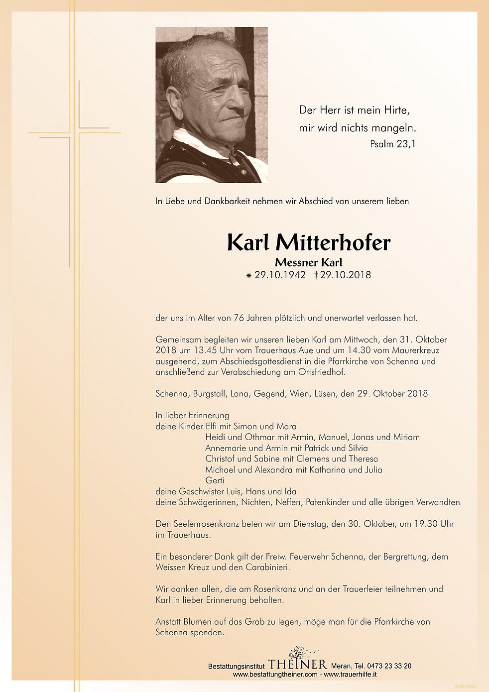 Gemeinsam begleiten wir unseren lieben Karl am Mittwoch, den 31. Oktober 2018 um 13.45 Uhr vom Trauerhaus Aue und um 14.30 vom Maurerkreuz ausgehend, zum Abschiedsgottesdienst in die Pfarrkirche von Schenna und anschließend zur Verabschiedung am Ortsfriedhof.