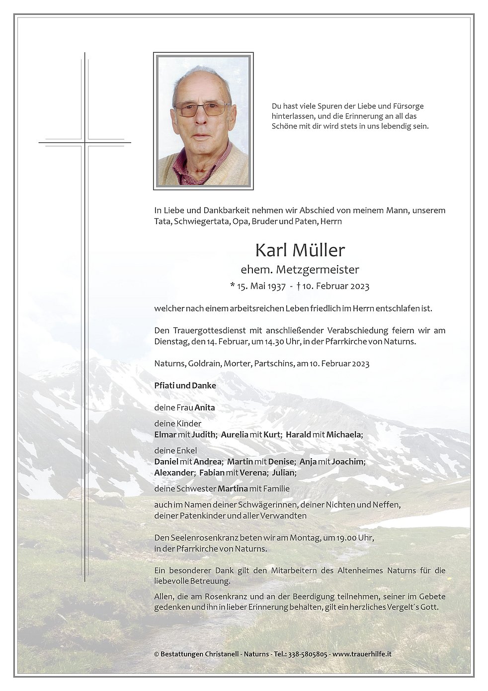 Den Trauergottesdienst mit anschließender Verabschiedung feiern wir am Dienstag, den 14. Februar, um 14.30 Uhr, in der Pfarrkirche von Naturns.
