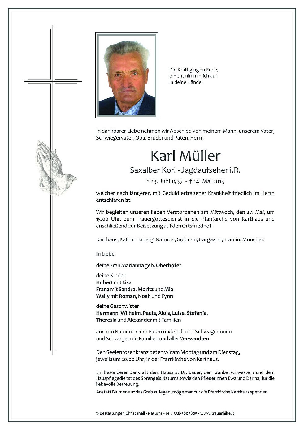 Wir begleiten unseren lieben Verstorbenen am Mittwoch, den 27. Mai, um 15.00 Uhr, zum Trauergottesdienst in die Pfarrkirche von Karthaus und anschließend zur Beisetzung auf den Ortsfriedhof.