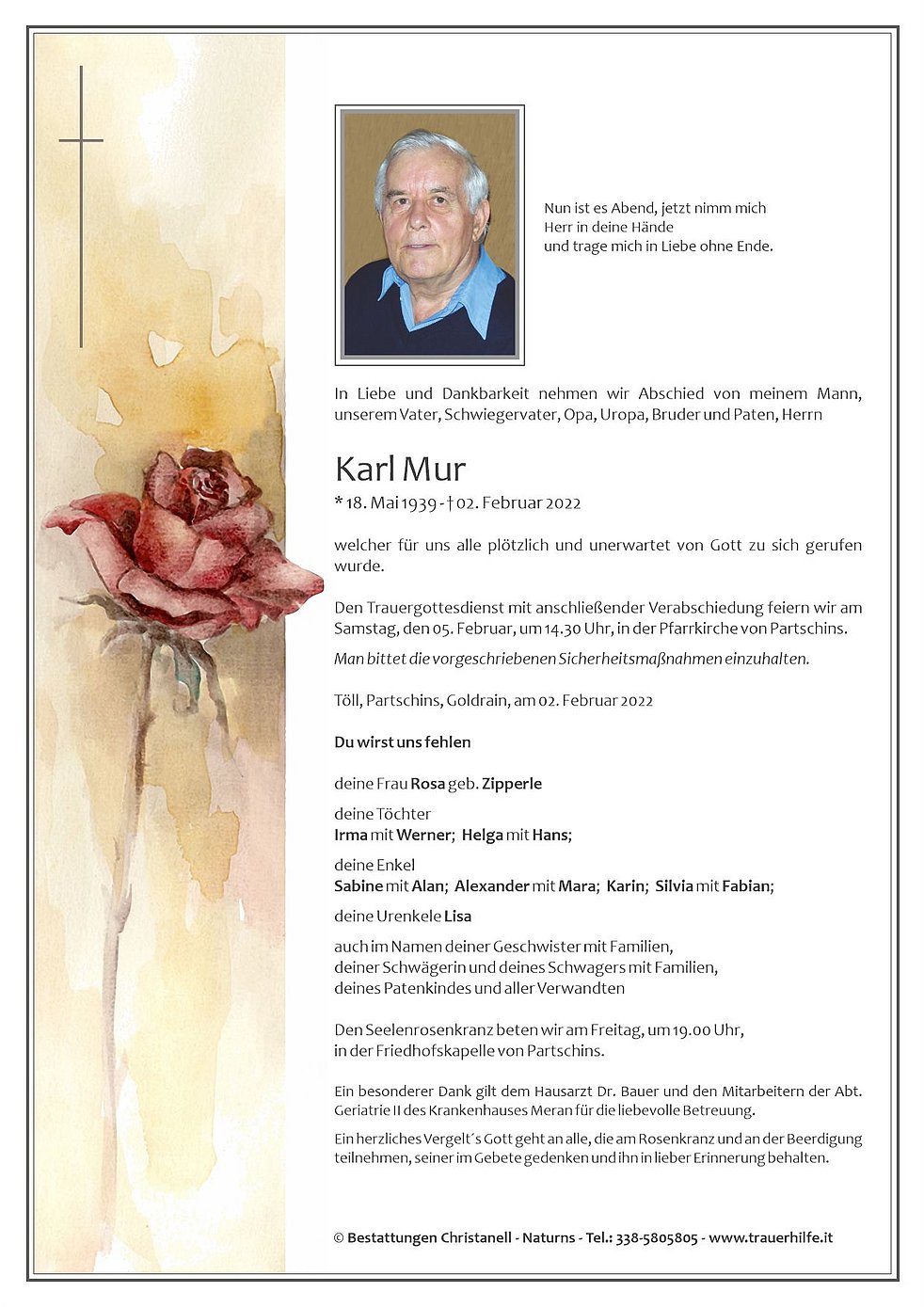 Den Trauergottesdienst mit anschließender Verabschiedung feiern wir am Samstag, den 05. Februar, um 14.30 Uhr, in der Pfarrkirche von Partschins.