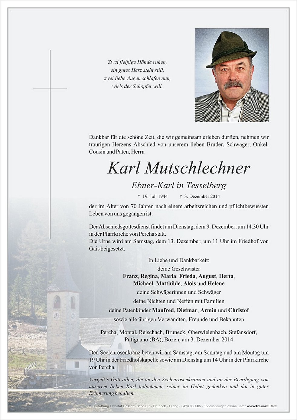 Vergelt’s Gott allen, die an den Seelenrosenkränzen und an der Beerdigung von unserem lieben Karl teilnehmen, seiner im Gebet gedenken und ihn in guter Erinnerung behalten.