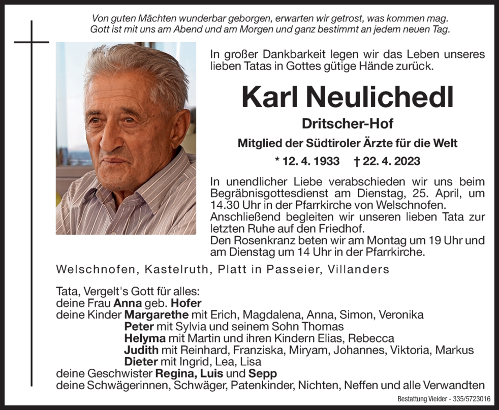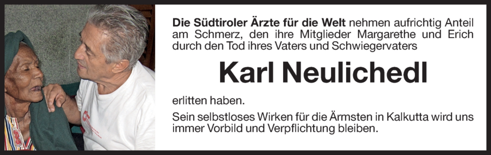 Statt Blumen aufs Grab zu legen bitten wir um Spenden zugunsten der Südtiroler Ärzte für die Welt. Kennwort: Kalkutta. IBAN IT25U0808111610000306005349