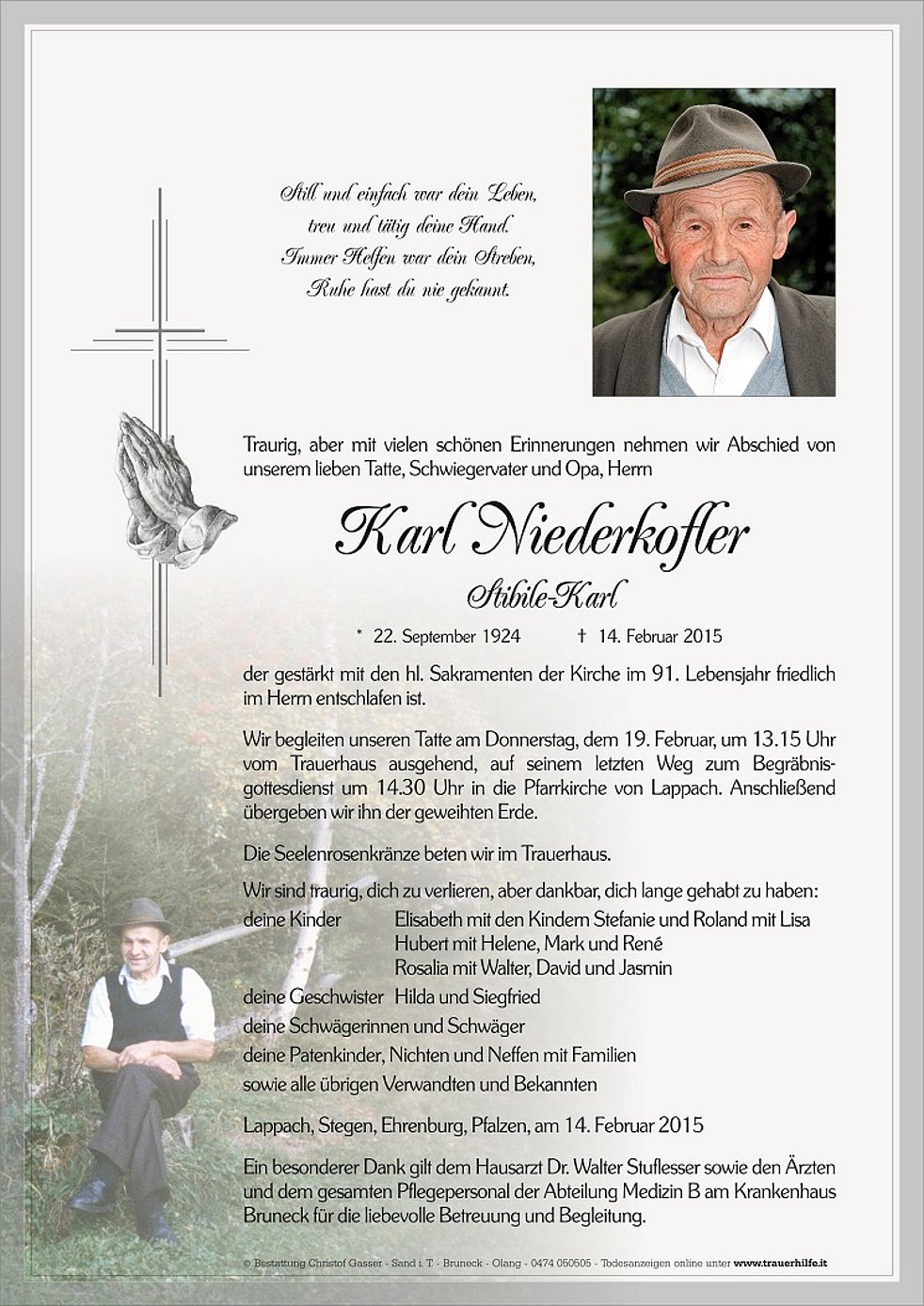 Wir begleiten unseren Tatte am Donnerstag, dem 19. Februar, um 13.15 Uhr vom Trauerhaus ausgehend, auf seinem letzten Weg zum Begräbnisgottesdienst um 14.30 Uhr in die Pfarrkirche von Lappach. Anschließend übergeben wir ihn der geweihten Erde.