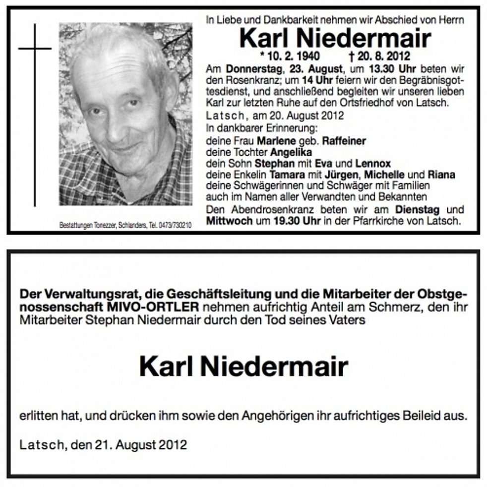 Am Donnerstag, 23. August, um 13.30 Uhr beten wir den Rosenkranz; um 14 Uhr feiern wir den Begräbnisgottesdienst, und anschließend begleiten wir unseren lieben Karl zur letzten Ruhe auf den Ortsfriedhof von Latsch.