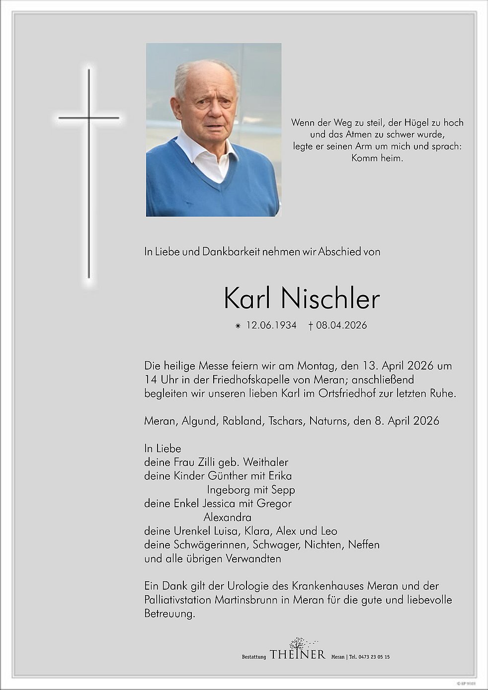 Die heilige Messe feiern wir am Montag, den 13. April 2026 um 14 Uhr in der Friedhofskapelle von Meran; anschließend begleiten wir unseren lieben Karl im Ortsfriedhof zur letzten Ruhe.