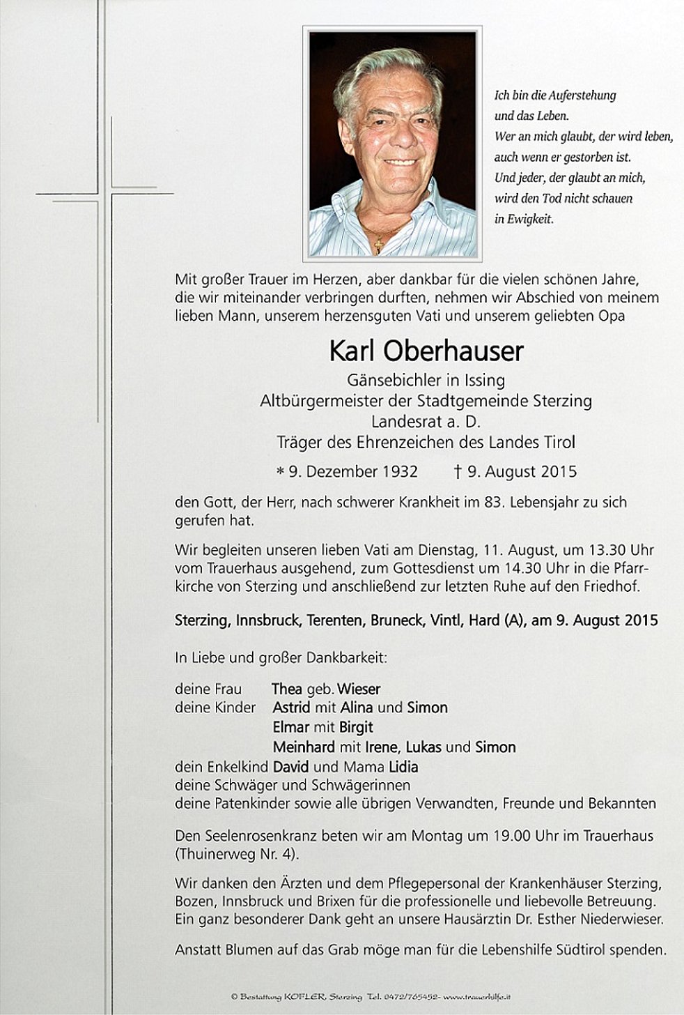 Anstatt Blumen auf das Grab möge man für die Lebenshilfe Südtirol spenden.