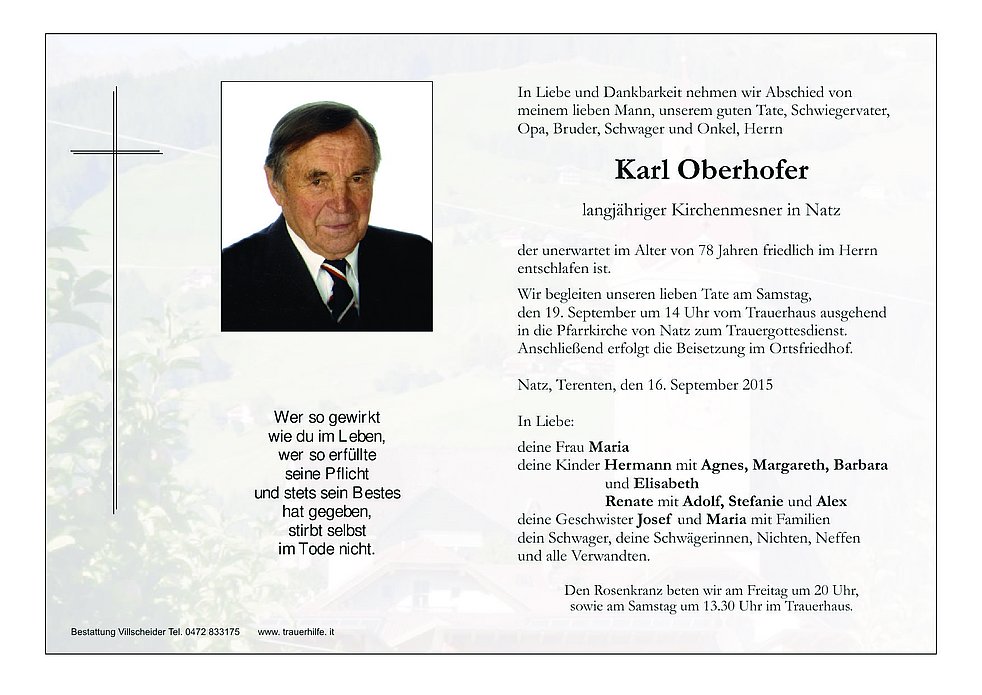 Ihr Vater war im Glauben und im Gebet beheimatet. Er möge Sie und die Pfarrgemeinde Natz nun von der anderen Seite des Lebens begleiten und ein starker Fürsprecher bei Gott für Ihren weiteren Lebensweg sein! Herr gib ihm die ewige Ruhe!