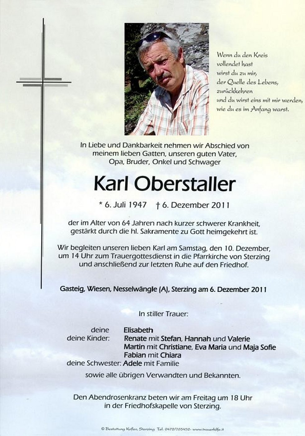 Wir begleiten unseren lieben Karl am Samstag, den 10. Dezember,