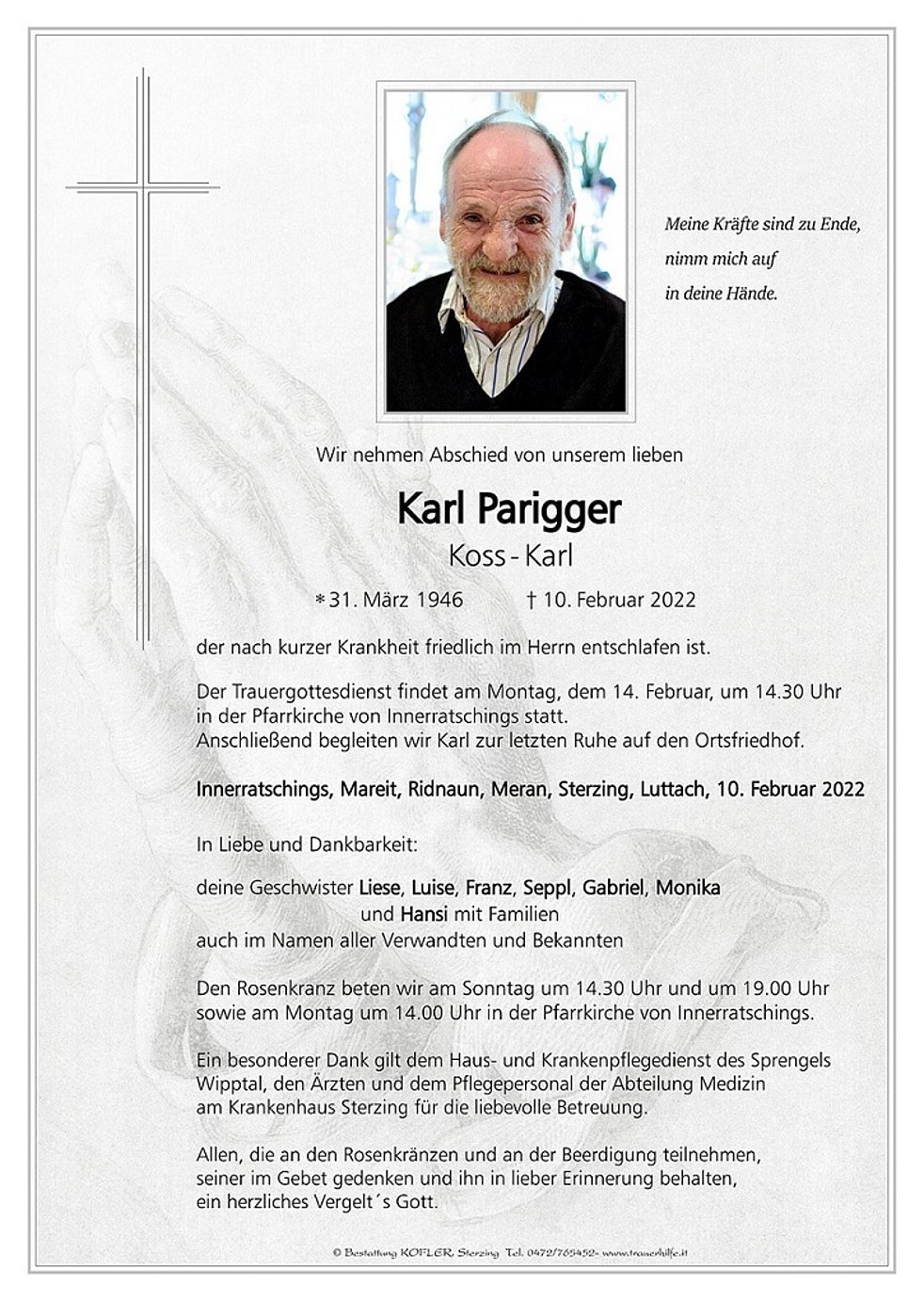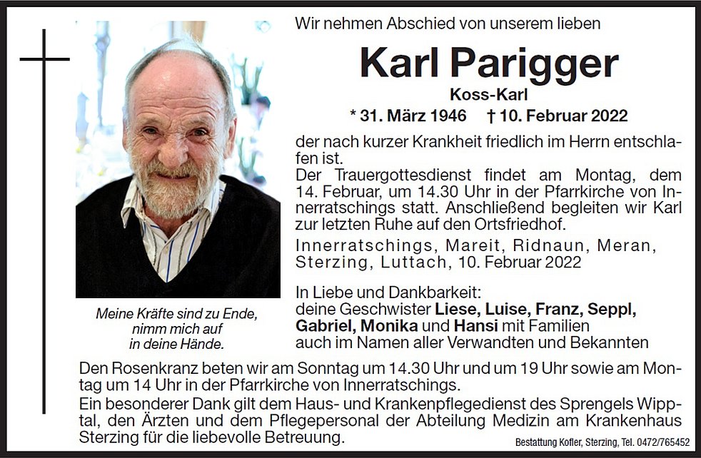 Der Trauergottesdienst findet am Montag, dem 14. Februar, um 14.30 Uhr in der Pfarrkirche von Innerratschings statt. Anschließend begleiten wir Karl zur letzten Ruhe auf den Ortsfriedhof.