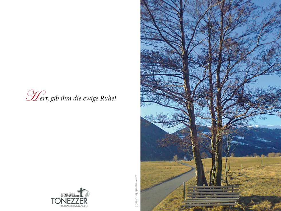 Wir begleiten unseren lieben Verstorbenen am Montag, 14. November, um 14 Uhr von der Leichenkapelle aus zum Begräbnisgottesdienst mit anschließender Verabschiedung in die Pfarrkirche von Glurns.