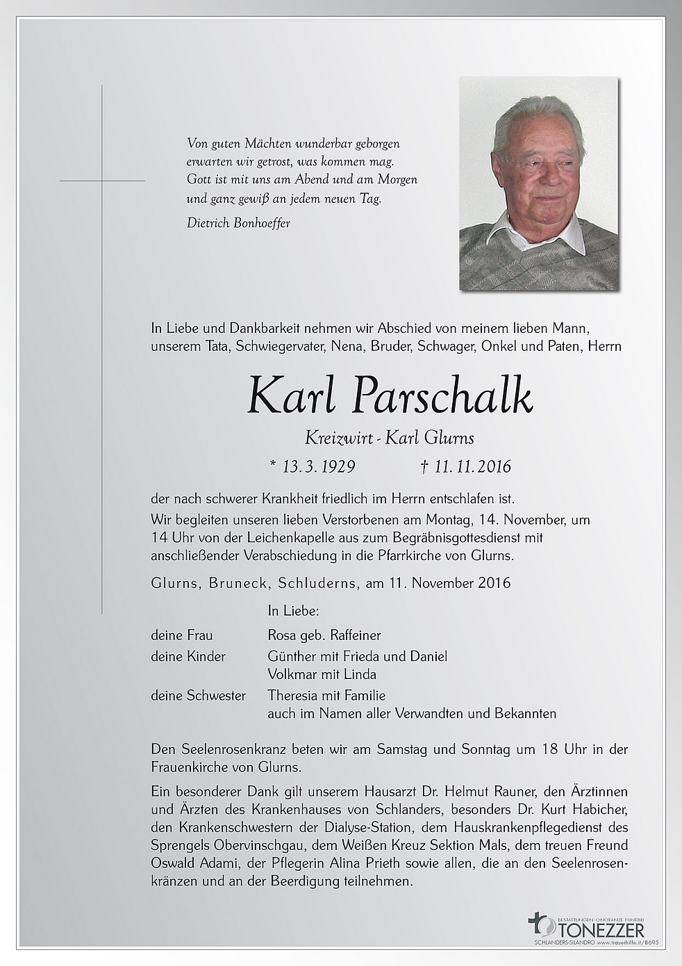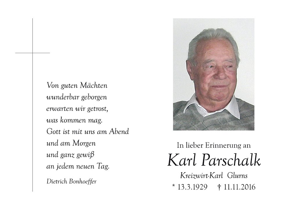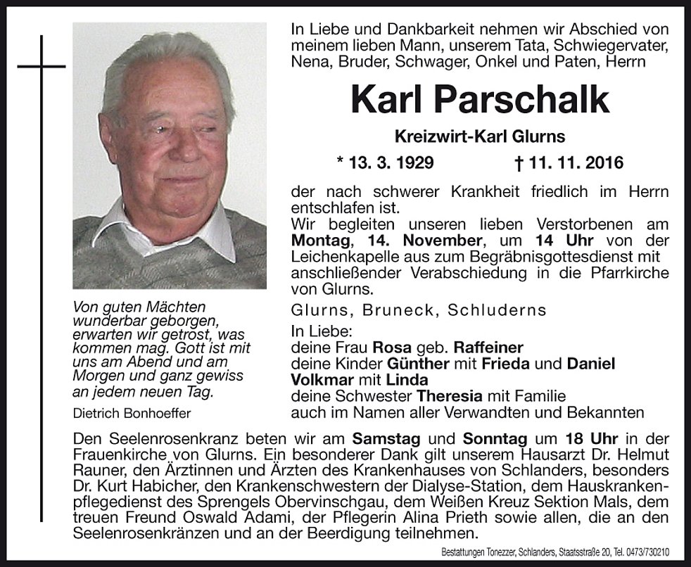 Ein besonderer Dank gilt unserem Hausarzt Dr. Helmut Rauner, den Ärztinnen und Ärzten des Krankenhauses von Schlanders, besonders Dr. Kurt Habicher, den Krankenschwestern der Dialyse-Station, dem Hauskrankenpflegedienst des Sprengels Obervinschgau, dem Weißen Kreuz Sektion Mals, dem treuen Freund Oswald Adami, der Pflegerin Alina Prieth sowie allen, die an den Seelenrosenkränzen und an der Beerdigung teilnehmen.