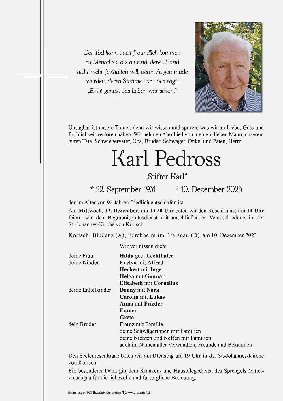 Unsagbar ist unsere Trauer, denn wir wissen und spüren, was wir an Liebe, Güte und Fröhlichkeit verloren haben. Wir nehmen Abschied von meinem lieben Mann, unserem guten Tata, Schwiegervater, Opa, Bruder, Schwager, Onkel und Paten, Herrn