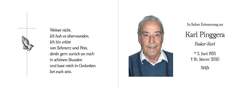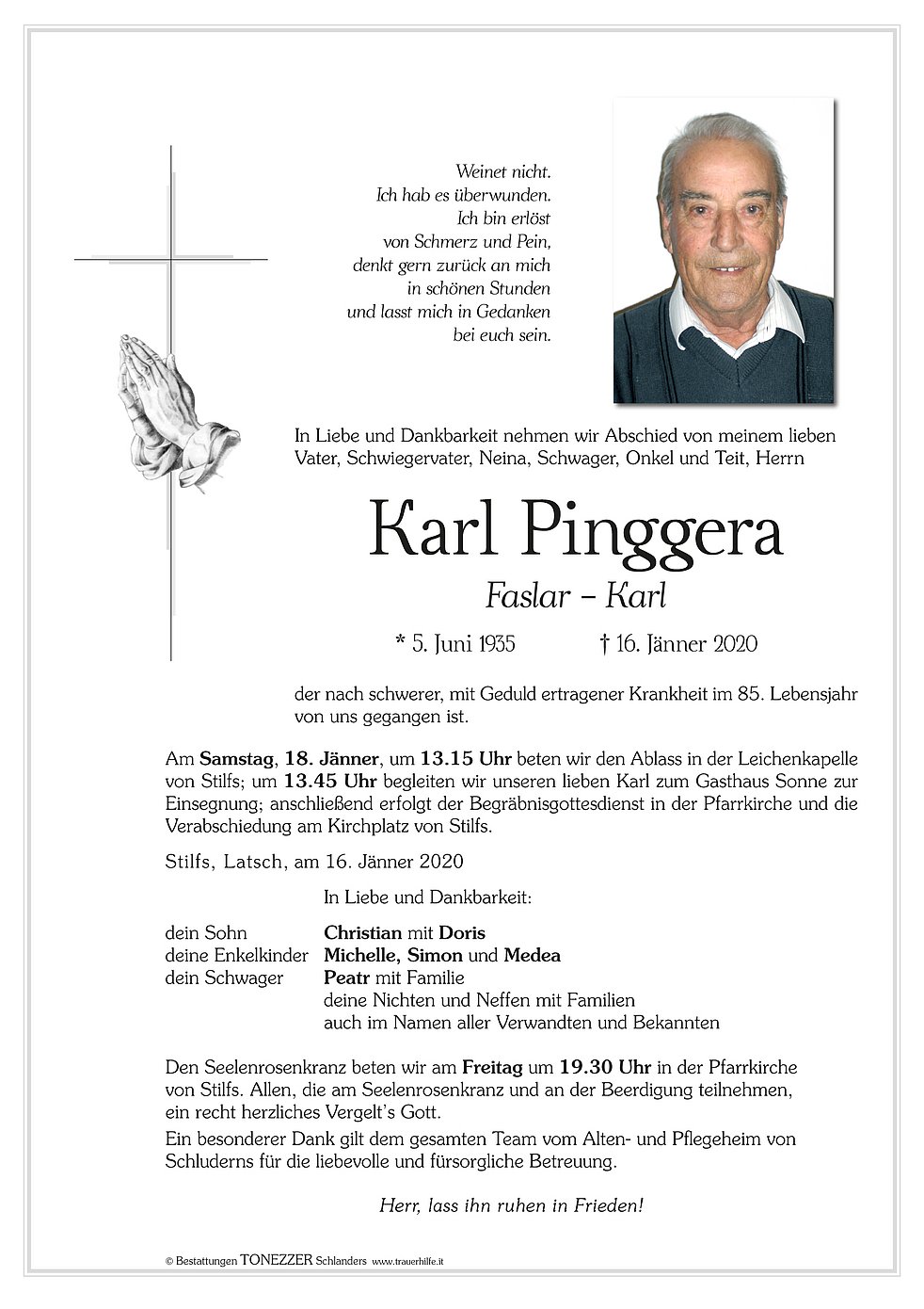 Am Samstag, 18. Jänner, um 13.15 Uhr beten wir den Ablass in der Leichenkapelle von Stilfs; um 13.45 Uhr begleiten wir unseren lieben Karl zum Gasthaus Sonne zur Einsegnung; anschließend erfolgt der Begräbnisgottesdienst in der Pfarrkirche und die Verabschiedung am Kirchplatz von Stilfs.