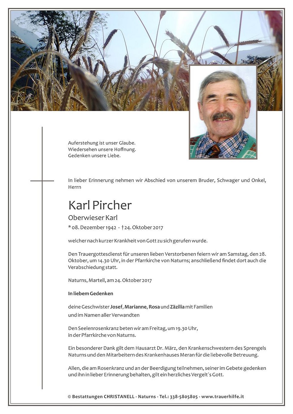 Den Trauergottesdienst für unseren lieben Verstorbenen feiern wir am Samstag, den 28. Oktober, um 14.30 Uhr, in der Pfarrkirche von Naturns; anschließend findet dort auch die Verabschiedung statt.