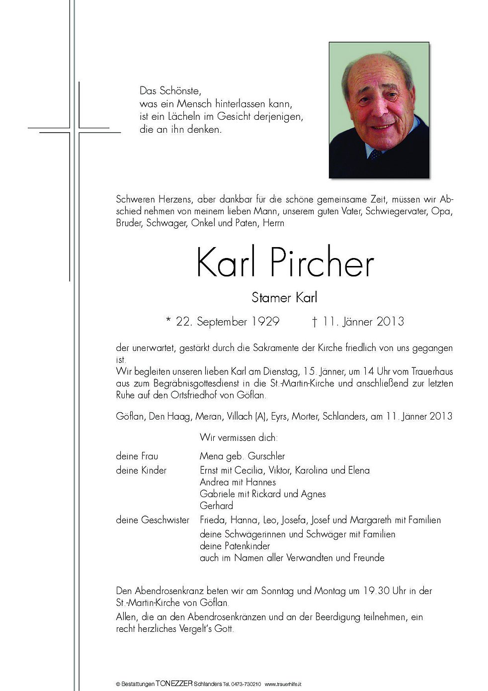 Wir begleiten unseren lieben Karl am Dienstag, 15. Jänner, um 14 Uhr vom Trauerhaus aus zum Begräbnisgottesdienst in die St.-Martin-Kirche und anschließend zur letzten Ruhe auf den Ortsfriedhof von Göflan.