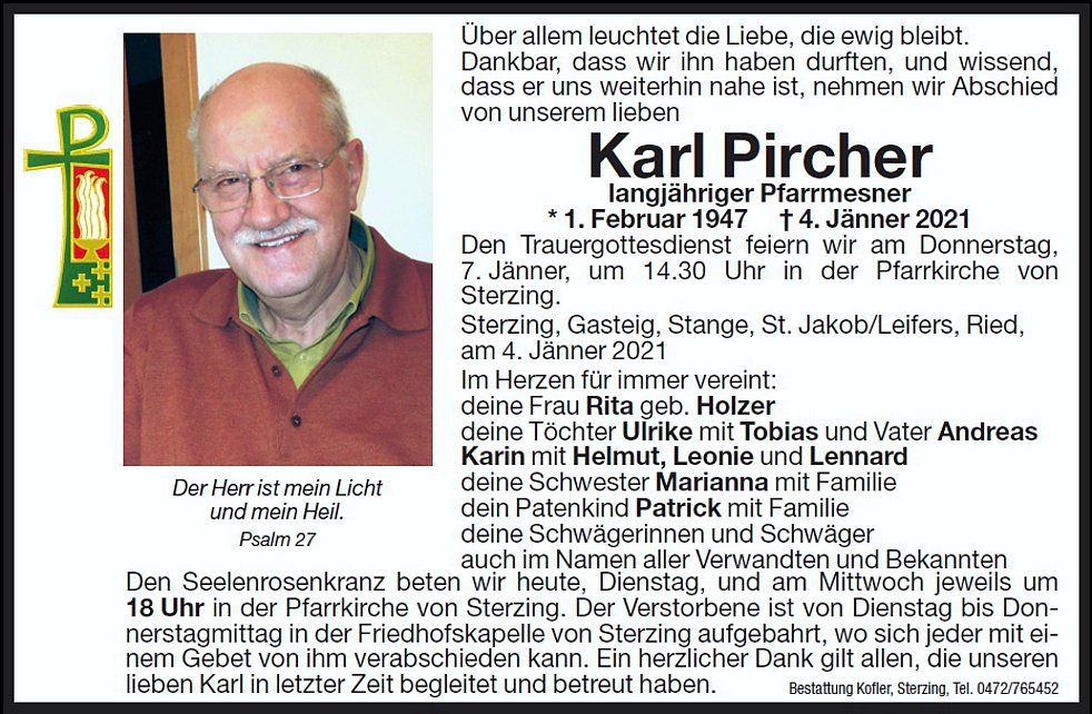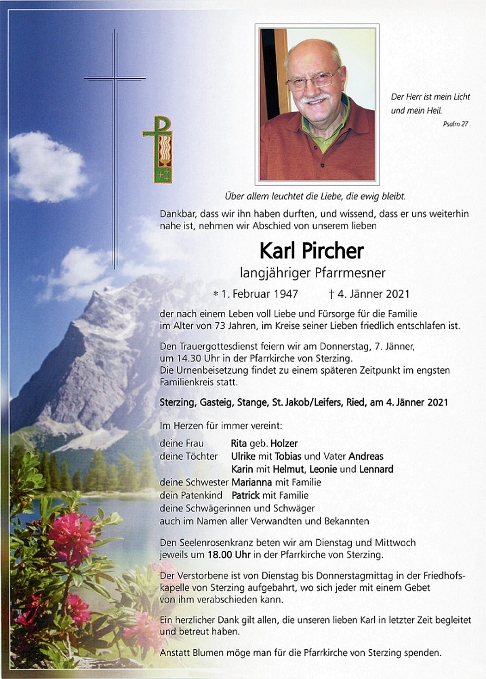 Den Trauergottesdienst feiern wir am Donnerstag, 7. Jänner, um 14.30 Uhr in der Pfarrkirche von Sterzing.