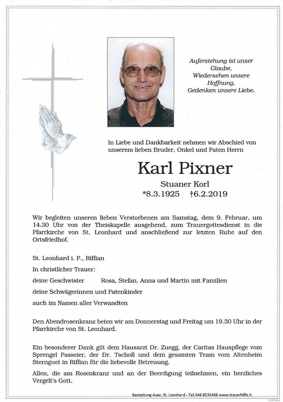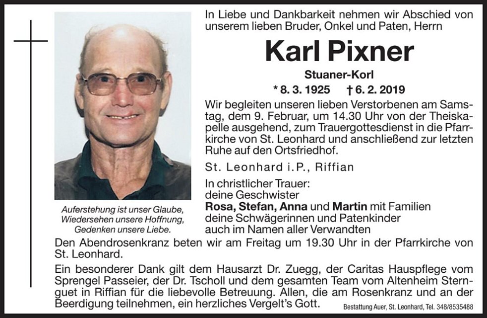 Wir begleiten unseren lieben Verstorbenen am Samstag, dem 9. Februar, um 14.30 Uhr von der Theiskapelle ausgehend, zum Trauergottesdienst in die Pfarrkirche von St. Leonhard und anschließend zur letzten Ruhe auf den Ortsfriedhof.