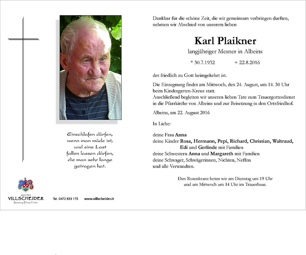 Anschließend begleiten wir unseren lieben Tate zum Trauergottesdienst in die Pfarrkirche von Albeins und zur Beisetzung in den Ortsfriedhof.