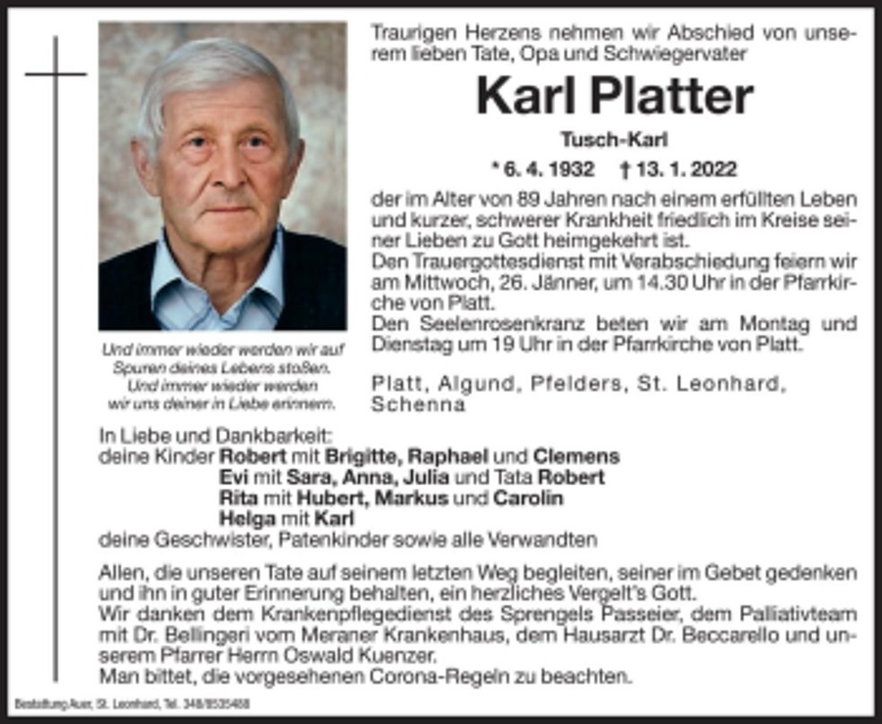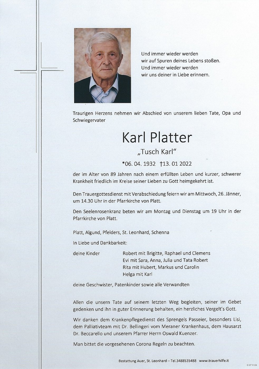 Den Trauergottesdienst mit Verabschiedung feiern wir am Mittwoch, 26. Jänner, um 14.30 Uhr in der Pfarrkirche von Platt.